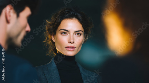 Confident woman leader in blazer turtleneck office team meeting focus portrait serious professional collaboration driving momentum with calm determination and cinematic mood