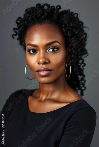 Confident Young Woman with Curly Hair in Elegant Portrait Against Grey Background