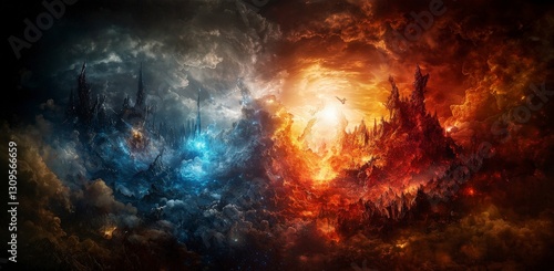 Conflict of three dimensions heaven earth and the underworld in epic fantasy landscape