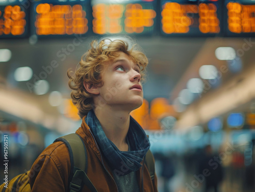 Confused traveler looking at flight information board in a crowded airport terminal, natural lighting