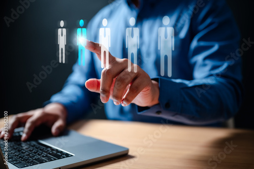 connection, network, social, communication, human, employee, group, recruitment, community, strategy. businessman touching virtual human icon for business management by using social media technology.