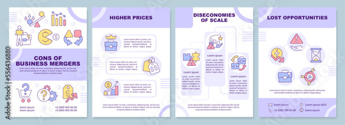 Cons of business mergers purple brochure template. High prices. Leaflet design with linear icons. Editable 4 vector layouts for presentation, annual reports. Arial-Black, Myriad Pro-Regular fonts used