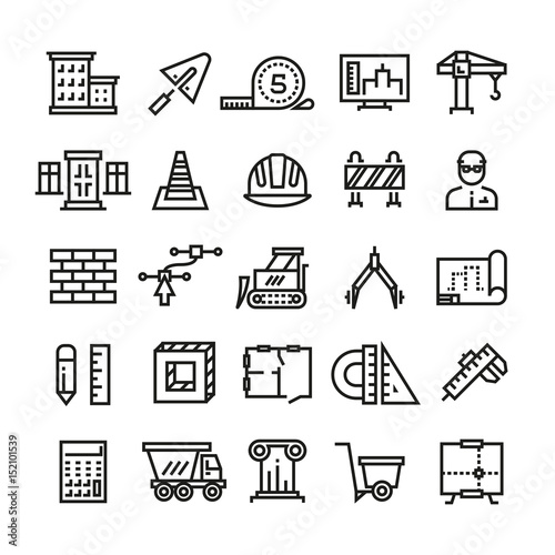 Construction industry, building house, architectural engineering and machinery thin line vector icons