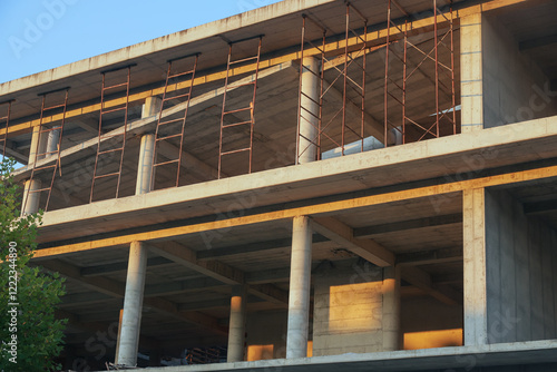 Construction site in Albania featuring raw concrete structure under a clear sky during golden hour