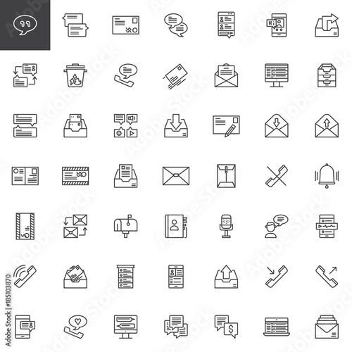 Contact and communication line icons set, outline vector symbol collection, linear style pictogram pack. Signs, logo illustration. Set includes icons as envelope, mailbox, contact book, chat, message