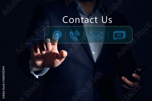 Contact us or Customer support hotline, Businessman touching on virtual screen contact icons (email, address, live chat, telephone). Customer service, helpdesk advice online support people connect.