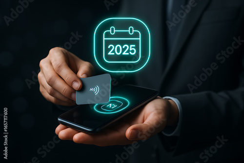 Contactless payment with calendar 2025 hologram on smartphone | Pagamento sem contacto com calendário 2025 holograma em smartphone