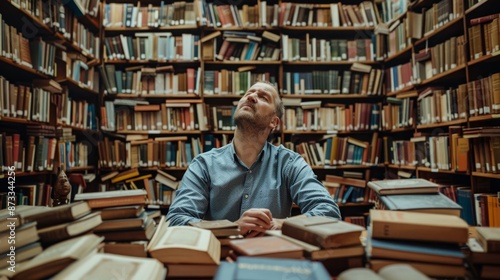 Contemplative Man Surrounded by Books in a Library
