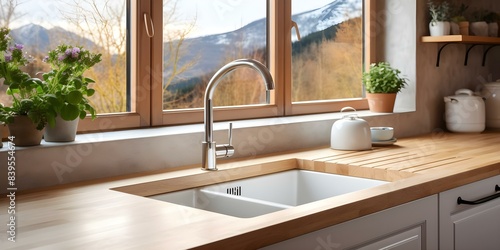 Contemporary Kitchen with Wooden Worktop, Sink, Faucet, and Window View. Concept Kitchen Design, Wooden Worktop, Sink, Faucet, Window View, Contemporary Style