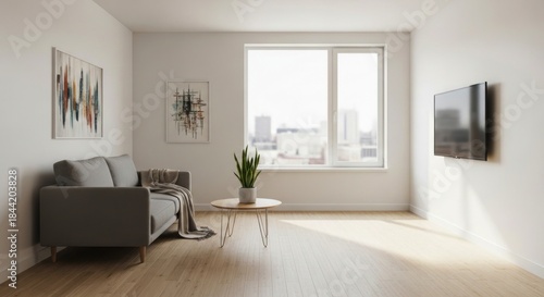 Contemporary living area features minimalist furniture and bright natural light from a large window