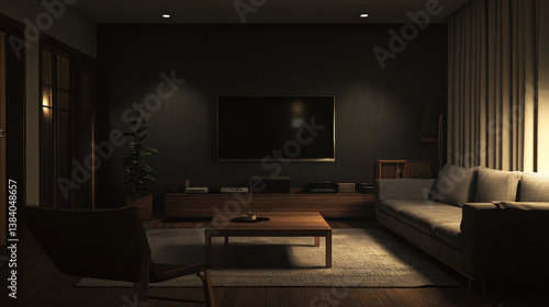 Contemporary living room with dark walls, a sleek flat-screen TV, and minimalist wooden furniture- 3D rendering