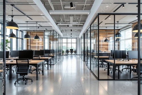 Contemporary office interior with glass partitions, open workspaces, wood accents, and industrial lighting in a modern design concept. Ai generative