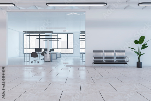 Contemporary white office hallway interior with furniture, window and city view. 3D Rendering.