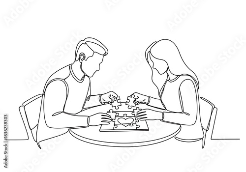 Continuous Line Drawing of Couple Assembling Heart Puzzle Together