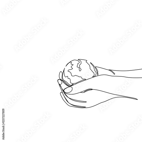 Continuous one line art drawing hands hold Earth globe. Save and protect earth planet linear concept. Vector illustration isolated on white background.
