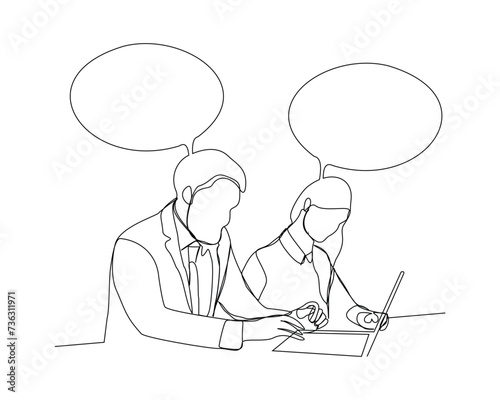 Continuous single line sketch drawing of two man and woman coworker talking something on laptop, bubble chat talk. One line art of office worker employee vector illustration