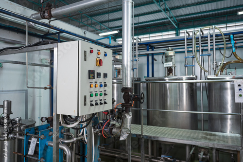 Control panel of stainless pipeline and tanks system at beverage processing plant
