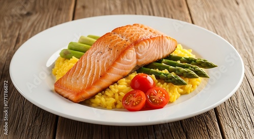 Cooked salmon fillet with yellow rice asparagus and cherry tomatoes fish food
