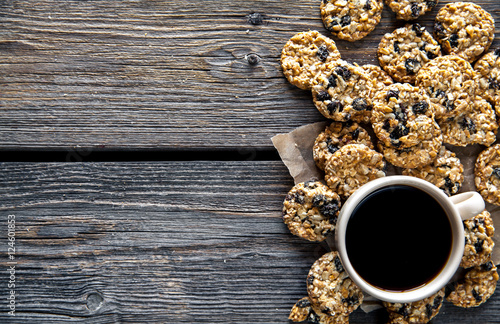 cookies with chocolate and coffee on a wooden background. drink, sweets, breakfast