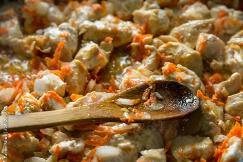 Cooking, sliced carrots and meat fried in a pan