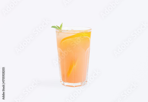 Cool orange lemonade served in a tall glass with fresh orange slices and mint leaves, refreshing summer drink perfect for cafes, restaurants or home, isolated on white background