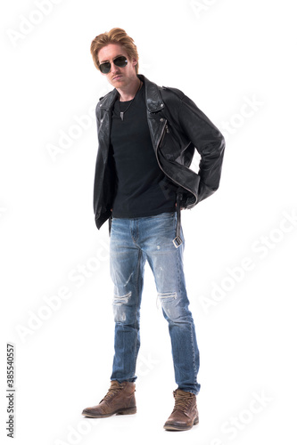 Cool relaxed stylish biker in leather jacket getting dressed with hands behind. Full body isolated on white background.