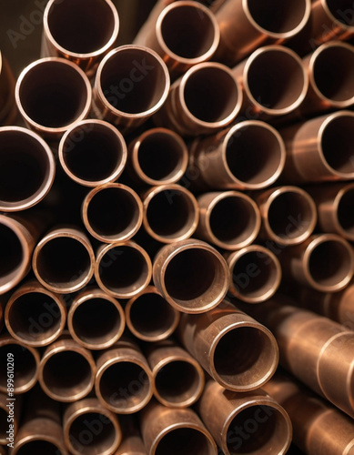 Copper bronze heat exchanger pipes. Heavy non-ferrous metallurgy. Factory industrial production of metal cuprum pipes. Heat exchanger is a technical device in which heat is exchanged between two media