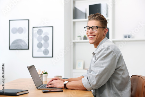 Copywriter using laptop at wooden table indoors