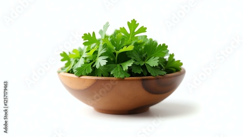 coriander placed in a rustic wooden bowl, isolated on a pure white background with a precise clipping path