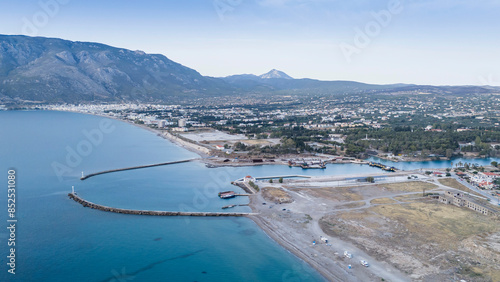 Corinth Canal, Greece. The Corinth Canal is a sluiceless shipping canal in Greece, connecting the Saronic Gulf of the Aegean and the Gulf of Corinth of the Ionian Sea, Aerial View