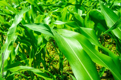 Corn big green leaves close-up