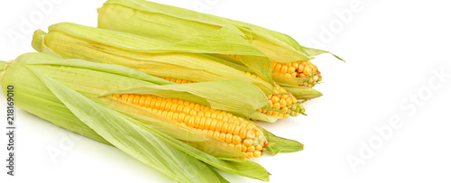 Corn cob isolated on white background. Wide photo . Free space for text.