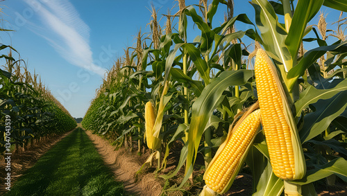 Corn cobs growing in a corn plantation field, surrounded by green leaves.