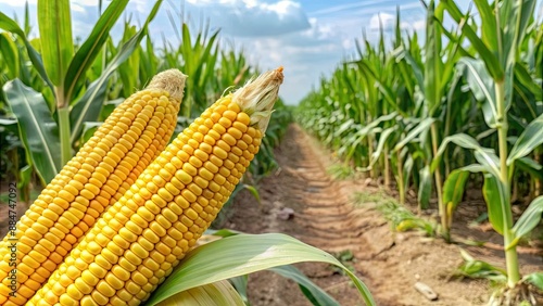 Corn cobs in a lush corn plantation field, corn, cobs, agriculture, farm, harvest, summer, crops, growth, green, rural, food