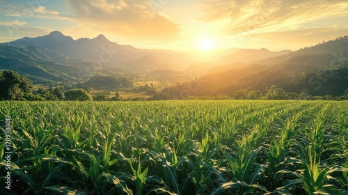 corn field or maize field for livestock feed, fuel ethanol production, corn flakes and other food at agriculture plantation farm in the morning sunrise