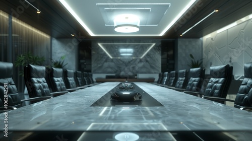 Corporate boardroom with conference table and audiovisual equipment