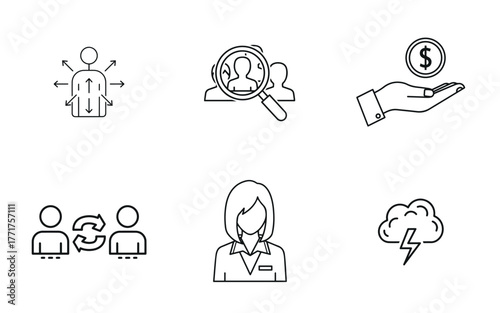 Corporate HR & Risk Management Icon Set: Recruitment, Skills, Finance, and Communication Transfer Vector