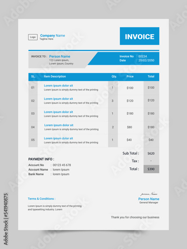 Corporate Invoice or Business Price receipt template, payment agreement template, Invoice bill template, and Invoice document template Design
