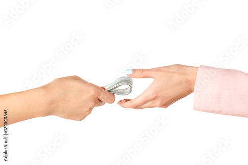 Corruption concept. Female hands with money on white background