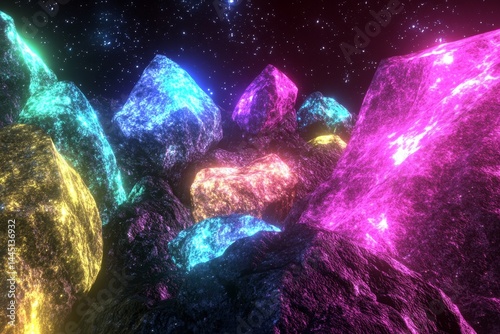 Cosmic, glowing rocks in vibrant colors