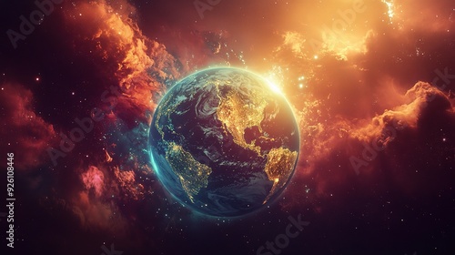 Cosmic Inferno: Earth engulfed in fiery nebula, vibrant cosmic art depicting our planet amidst swirling nebulae and celestial fire. A breathtaking view of Earth from space.