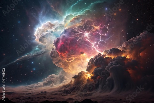 Cosmic Storm: A breathtaking cosmic storm rages across a dark expanse, vibrant lightning streaks illuminate swirling clouds of gas and dust, stars glitter in the distance.