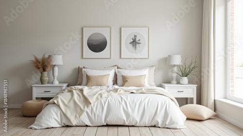 country interior design of modern bedroom with white and cream pillows on bed