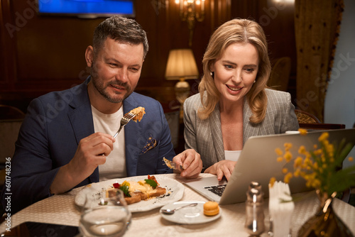 Couple eating in lobby-bar and watching tv show