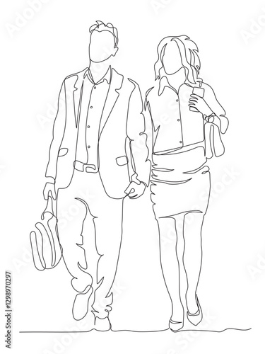 Couple hands holding and walking. Man in suit. Back view. Continuous line drawing. Black and white vector illustration in line art style.