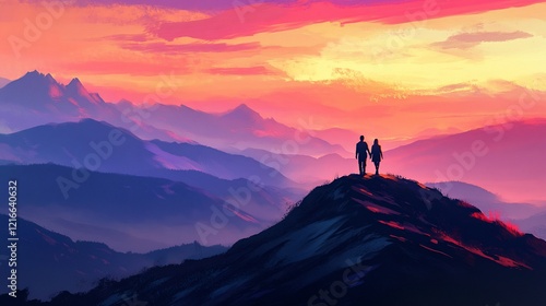 Couple holding hands atop mountain at sunset.