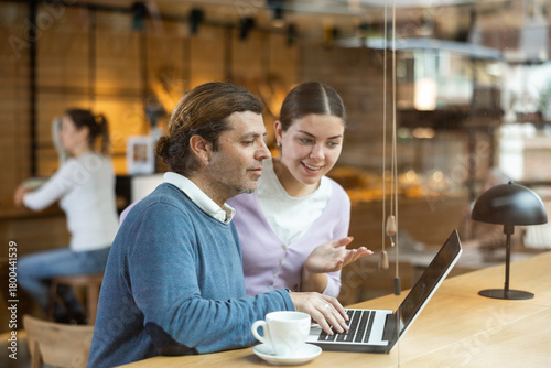 Couple of enthusiastic freelancer, young girl and adult man, working on new project on laptop and enjoying fragrant coffee in cozy modern cafe