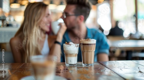 Couple sharing a dessert and coffee in a romantic coffee shop setting