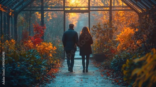 Couple walking through a greenhouse with autumn leaves