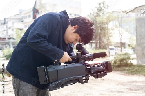 Covering an event with a video camera., Videographer takes video camera with free copy space for your text.